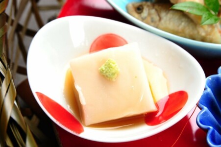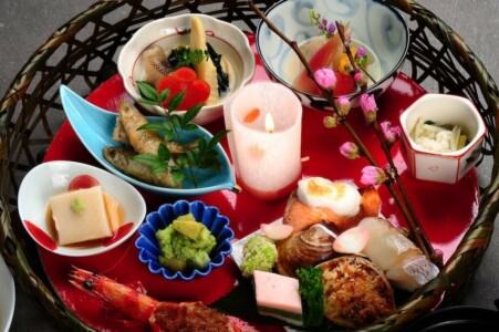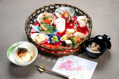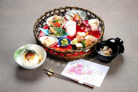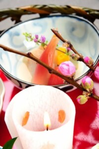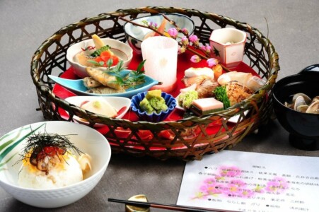 桜鱒の白酒焼き・桃華豆腐・菱餅・花弁百合根
