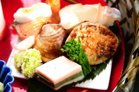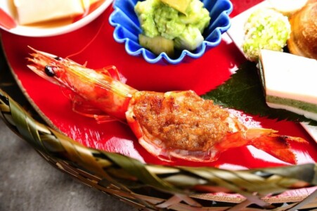 春子鯛鮨・空豆あられ揚げ・蛤黄金焼き・車海老の胡桃味噌