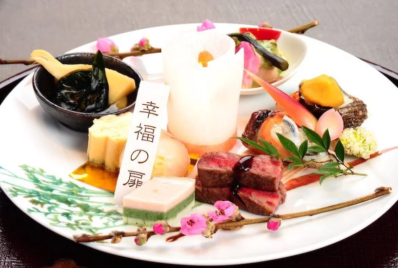 焼八寸 菱餅 ぼんぼり 姫栄螺ポテ焼 鯛手毬寿司 桜花チーズ 息吹焼 細魚風干し 空豆新挽粉揚げ 花弁百合根 広島産熟成牛、鱒白酒の炭火焼 若竹煮