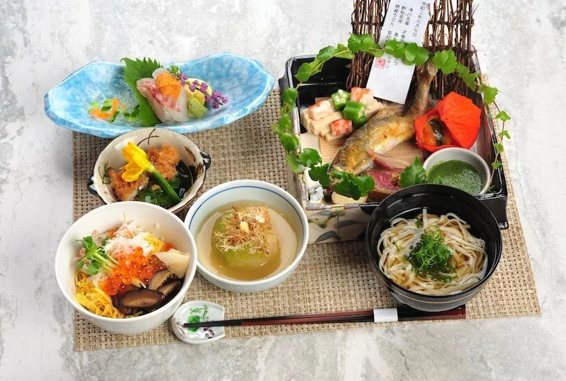 ・鯛の昆布〆 海胆 あしらい一式 ・鮎炭火焼き 蓼酢 筆茗荷 ・丸十レモン煮 ・鬼灯南瓜 ・天の川 才巻 オクラ ・鱧ざく ・広島牛ヒレカツ ・冬瓜饅頭 鶏スープ煮込み ・散し寿司 ガリ ・稲庭うどん
