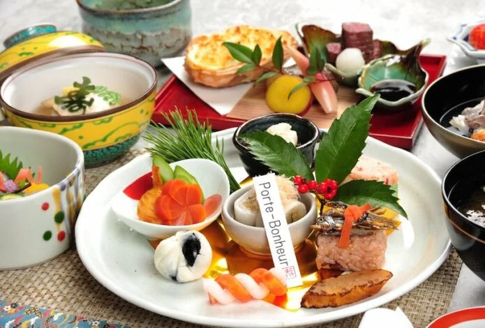 2022年 睦月御祝会席●椀物 鯛潮汁 (焼餅 焼葱 菜花 柚子) ●前菜 松竹梅 (松笠慈姑 萵苣薹 梅香人参) 海老の錦玉子 茶ぶり海鼠と大徳寺麩の白酢 紅白手綱 黒豆と百合根の茶巾 ごまめ赤飯 自家製唐墨 子持ち昆布奉書巻き ●造里 旬魚三種 あ…