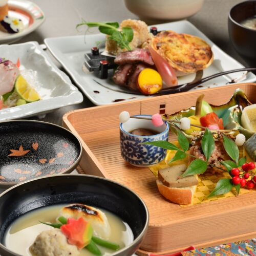 料理の盛り付けにも、日本の美意識が息づいています。季節の花や葉を添えた一皿は、まるで茶席の懐石料理のような上品な佇まいを見せます。華美ではなく、控えめながらも心に響く美しさを大切にしています。