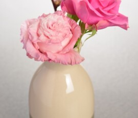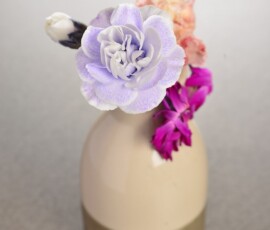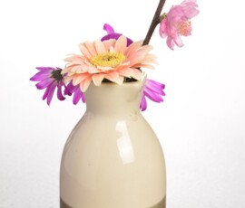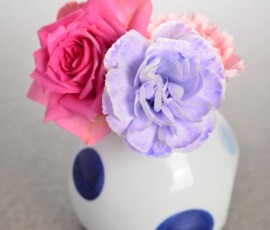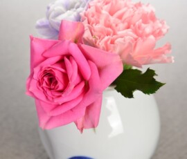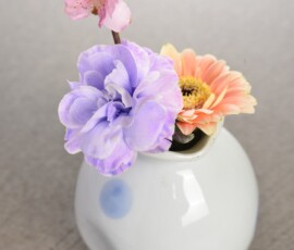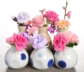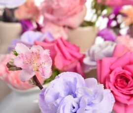 愛らしいブルーの水玉模様の丸い花瓶や、温かみのあるツートンカラーの器。そこに活けられているのは、目を惹く鮮やかなピンクのバラや、幾重にも重なる花びらが美しい淡い紫のカーネーション。そして、柔らかなオレンジ色のガーベラや、春の訪れを告げる可憐な桃の花などです。