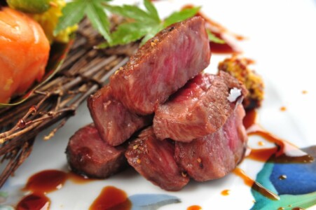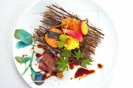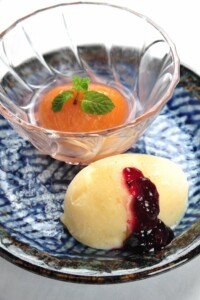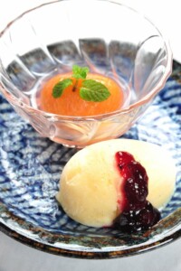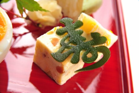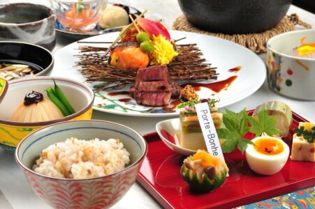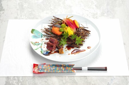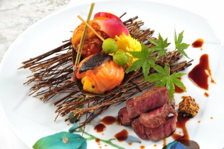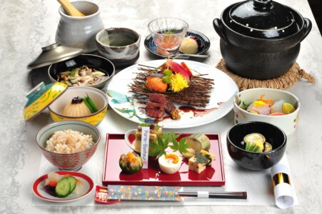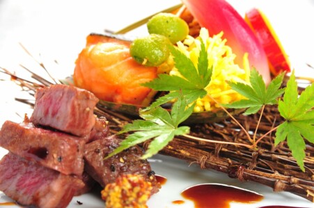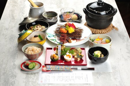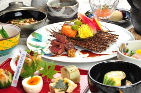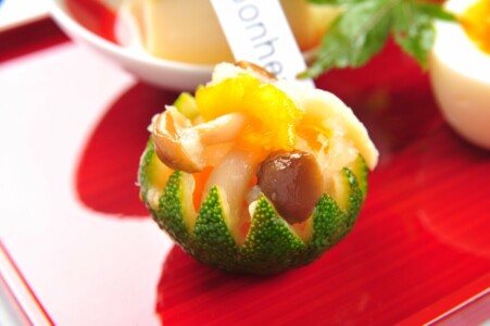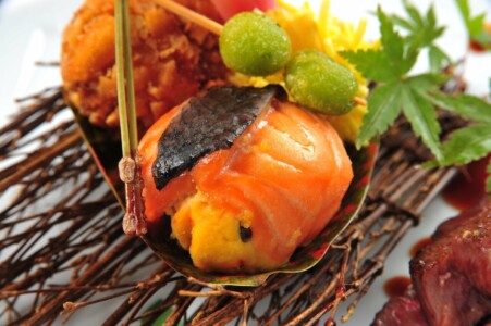 ●強肴 ・黒毛和牛ざぶとん炭火焼き ・秋鮭けんちん焼き ・小芋柿ピー揚げ ・毬栗 ・翡翠銀杏 ・松葉蕎麦 ・丸十レモン煮 筆茗荷