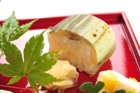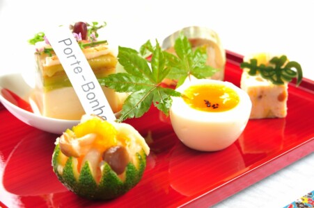 ●前菜 ・柿と湿地の霙和ゑ ・白秋寄せ 寿昆布 ・茄子萩豆腐 海老 小豆 花穂 ・幸福玉子 ・かます炙り鮨 ガリ