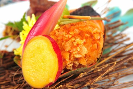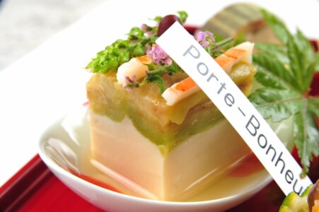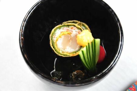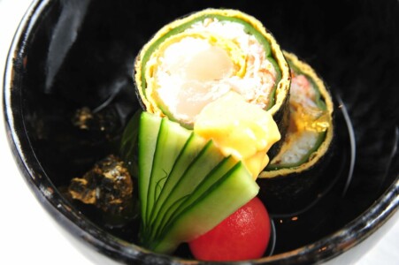 ●酢物 蟹と帆立の磯辺巻き 若芽 プチトマト 黄味酢 ジュレかけ