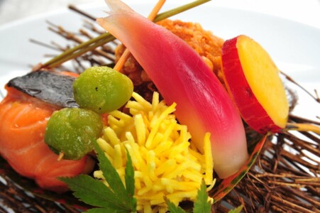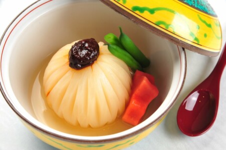 ●煮物 菊かぶら 合鴨射込み 紅葉麩 三度豆 生姜味噌
