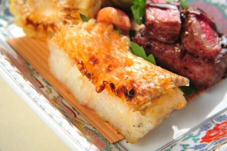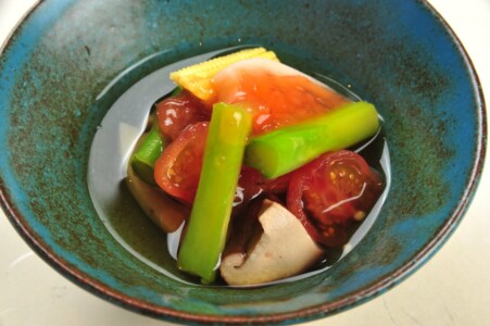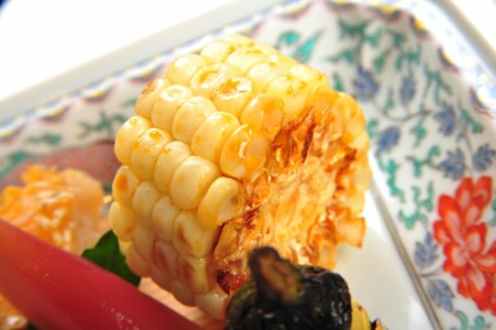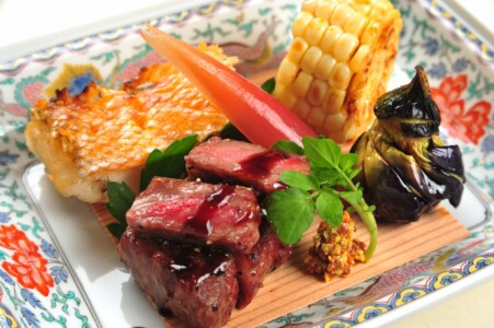 ●強肴 黒毛和牛・甘鯛松笠・玉蜀黍炭火焼き ・茶筅茄子田楽 筆茗荷