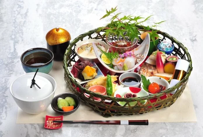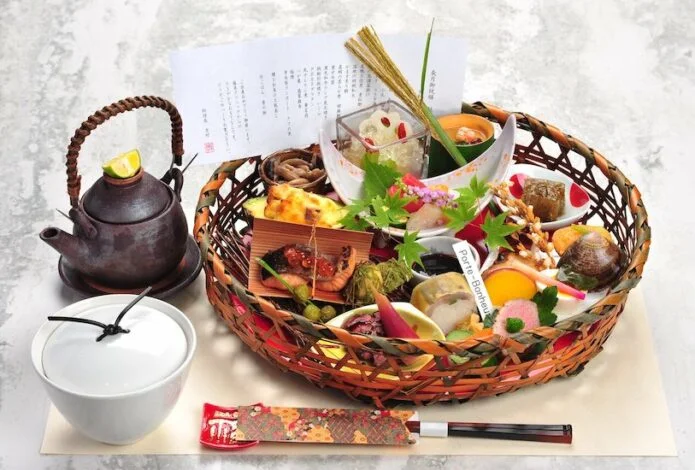 2021年 長月御祝膳祝竹籠盛り・造里盛合わせ あしらい一式 ・青竹豆腐 海老 小豆 もって菊 旨出し ・月見玉子 うさぎ海苔 杵生姜 ・蛤酒盗玉掛け ・真鴨土佐煮 青松酢 ・湿地の胡桃和ゑ ・かます炙り鮨 ・真蛸の柔らか煮 胡麻酢 ・寄せ水雲酢 ・黒毛和牛ラ…