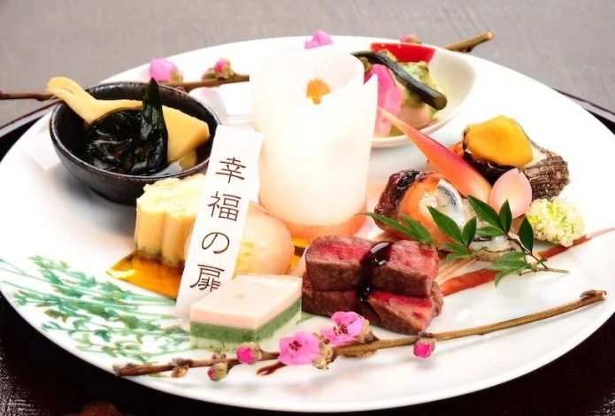 先附 車海老、長芋、海胆の花山葵ジュレ掛け 椀物 白魚豆腐 清汁仕立て 造里 三種盛り あしらい一式・蒸物 地穴子真丈 水前寺海苔 菜の花 焼八寸 菱餅 ぼんぼり 姫栄螺ポテ焼 鯛手毬寿司 桜花チーズ 息吹焼 細魚風干し 空豆新挽粉揚げ 花弁百合…