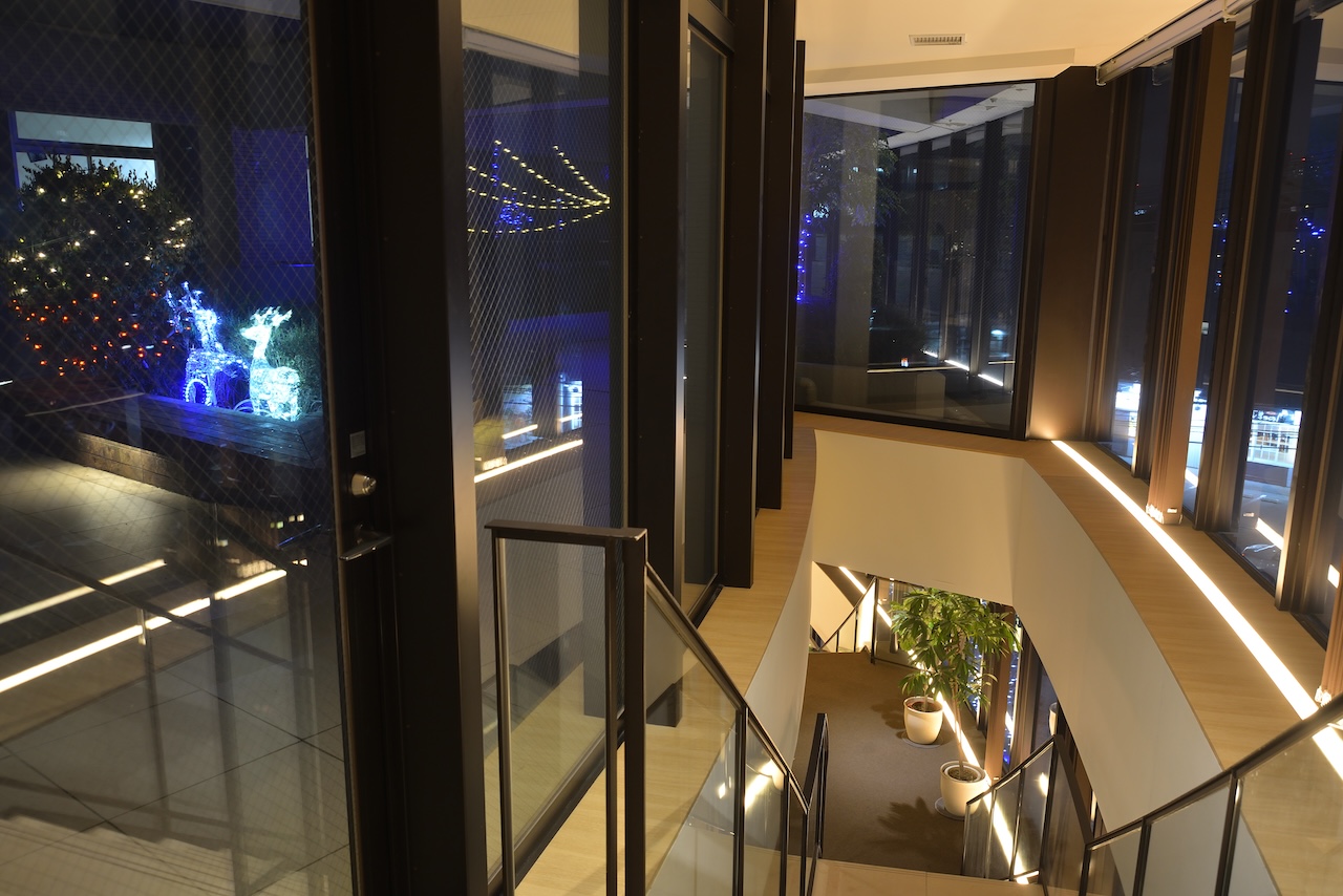 エントランスを抜けると広がるのは、ガラスと木目が美しく調和したロビー。