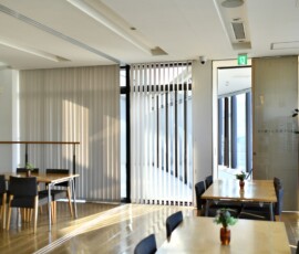 院内の木目を基調としたインテリアがその光を受け止め、空間全体を飴色の温もりで満たします。