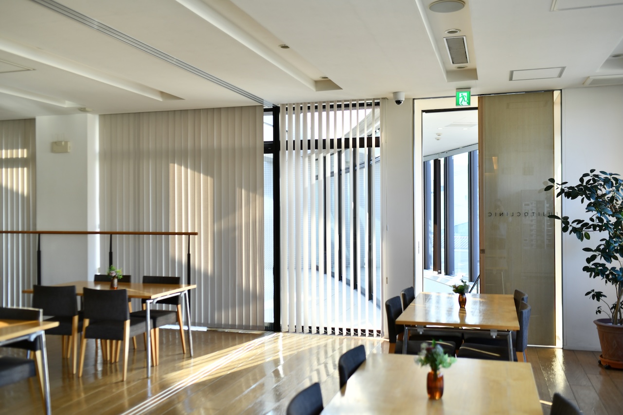 院内の木目を基調としたインテリアがその光を受け止め、空間全体を飴色の温もりで満たします。