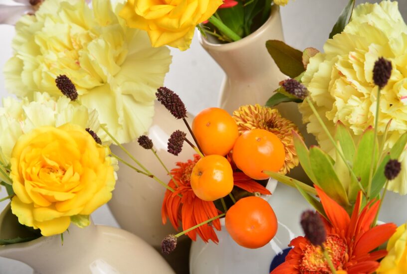 実りの季節である秋。今月の「Porte Bonheur」では、こっくりと深い赤や温かみのある橙色など、秋らしい色彩の花々が空間を彩ります。幾重にも花びらを重ねた優雅な花、風にそっと揺れる可憐な花が、見る人の心に豊かさと感謝の気持ちを届けます。新しい命の誕生という大きな実りを、季節の恵みと共に祝うような、穏やかで華やかなしつらえです。