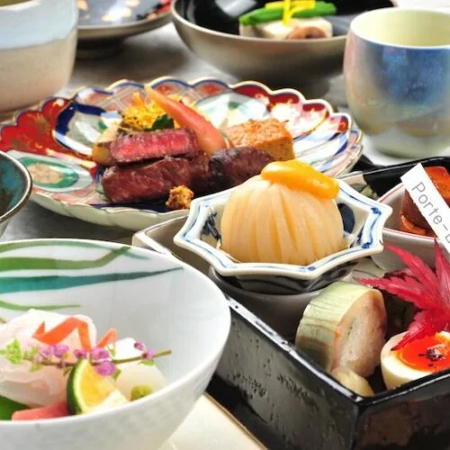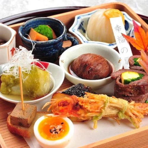 強肴 広島産熟成牛炭火、秋鮭奉書焼き 子持ち鮎有馬煮 小芋おかき揚げ 紅葉麩 松葉蕎麦 いちょう丸十 筆茗荷