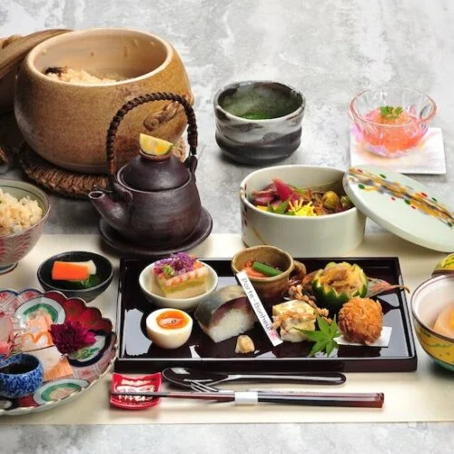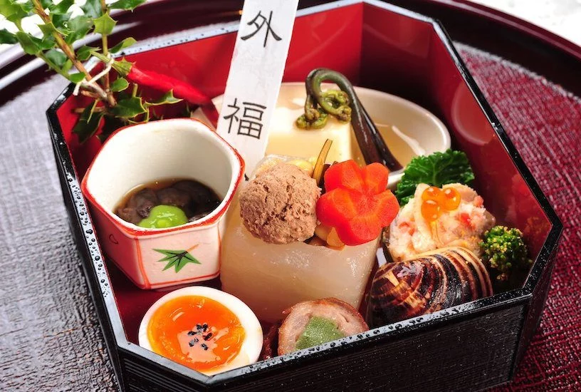 ●前菜 福豆煮(升大根・大豆昆布煮・鴨丸・梅人参) 百合根豆腐 かぎ蕨 文銭巻き 海鼠と海鼠腸の鶯餡掛け 蛤雪花菜寿し 幸福玉子