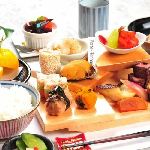 ●強肴 鰆西京焼き 筆茗荷 ・ 黒毛和牛らんぷ炭火焼き ・ 山菜サラダ