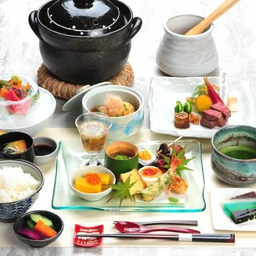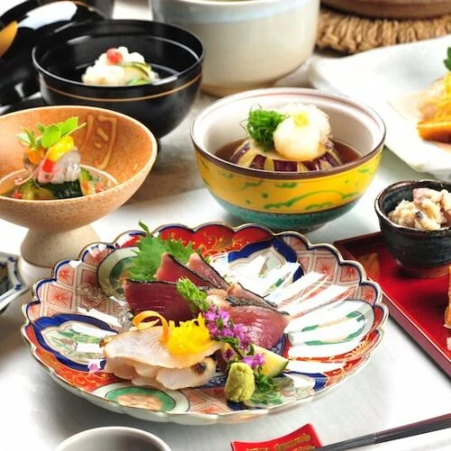 ●前菜 朧玉子 菜の花 蝶丸十 ・ 筍挟み揚げ ・ 百合根饅頭 ・ 子持ち昆布 独活 行者にんいく ・ 細魚桜干し ・蕗花筏 花弁 ・ 伊佐木飯蒸し