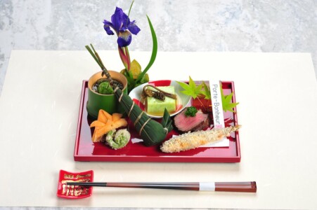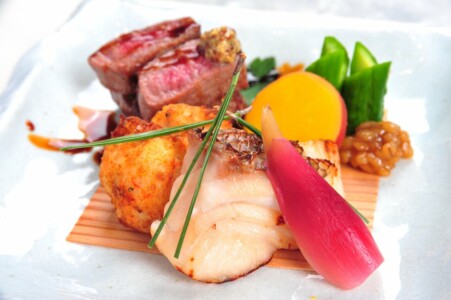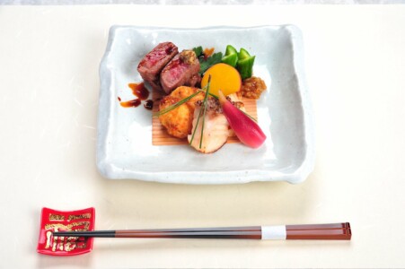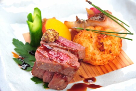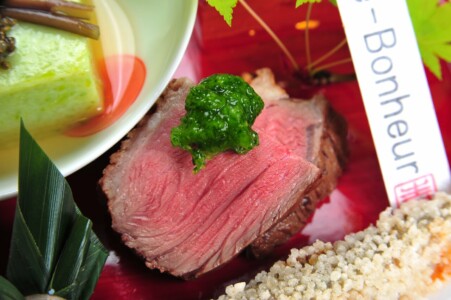 ●強肴 天然鯛酒盗焼き ・黒毛和牛らんぷ炭火焼き ・桜海老真丈 ・丸十レモン煮 ・筆茗荷 ・もろみ胡瓜