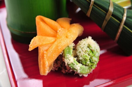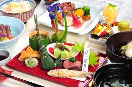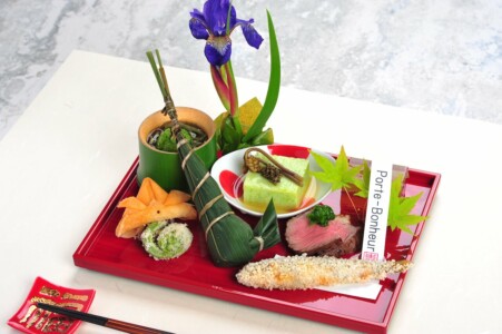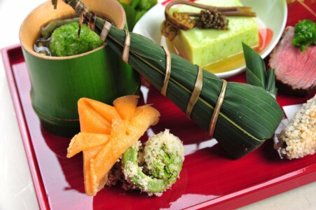 ●前菜 順才 オクラ 加減酢 ・アスパラ豆腐 旨出し ・蕗筏 ・稚鮎新挽粉揚げ こごみと砂肝の卯の花和ゑ 兜 ・鱚の粽鮨