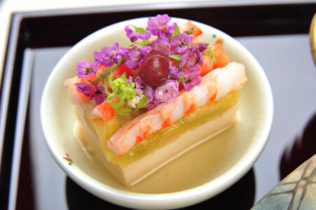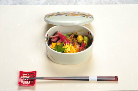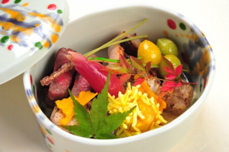 ●強肴 吹寄せ盛り 黒毛和牛ランプ炭火焼き ・かます酒盗焼き ・子持鮎甘露煮 ・翡翠銀杏 ・毬栗 ・松葉蕎麦 ・いちょう丸十 ・鶏肝パテ ・筆茗荷