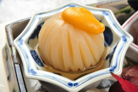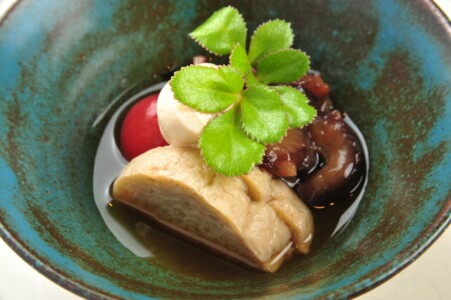 ●酢物 茶ぶり海鼠 大徳寺麩 若芽 プトマト 防風 白酢クリームかけ