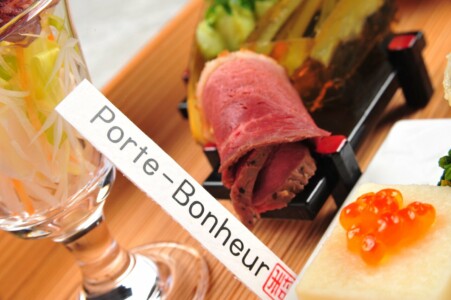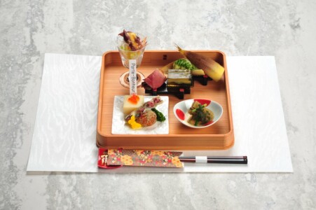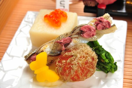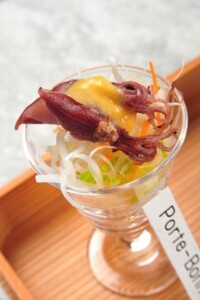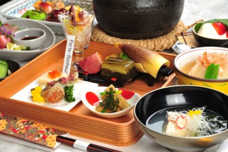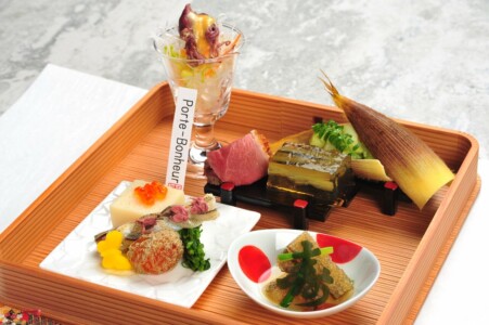 ●前菜 筍木の芽和ゑ ・百合根豆腐 いくら ・細魚桜干し ・蕗筏 ・菜の花 朧月 蝶丸十 ・子持ち昆布と山菜お浸し ・ 真鴨燻製 ・蛍烏賊ハリハリサラダ 辛子酢味噌ドレッシング
