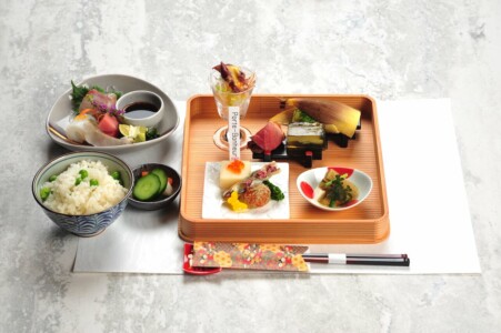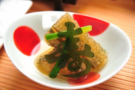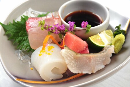 ●造里 旬魚三種 あしらい一式 ●蒸物 新玉葱の帆立真薯鋳込み 共地あん 生姜 糸花
