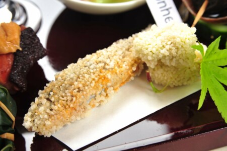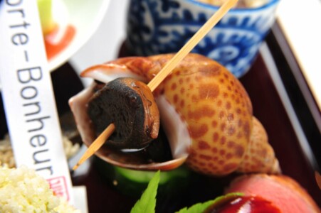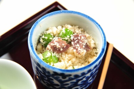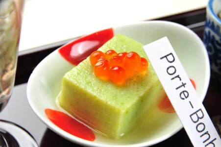 ●前菜 アスパラ豆腐 イクラ ・バイ貝旨煮 ・鱚の粽鮨 ・地蛸柔ら煮 胡麻酢 ・稚鮎 空豆 新挽粉揚げ 兜 ・砂肝卯の花和ゑ ・真鴨 新緑酢