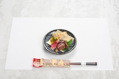縞鯵、鮪、水烏賊という3種の新鮮な刺身が、氷鉢の中で宝石のように輝きます。あしらい一式と共に、目でも舌でも楽しめる贅沢な一皿となっています。