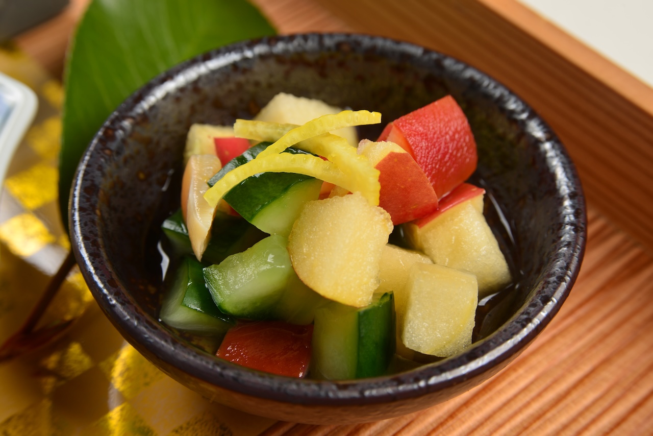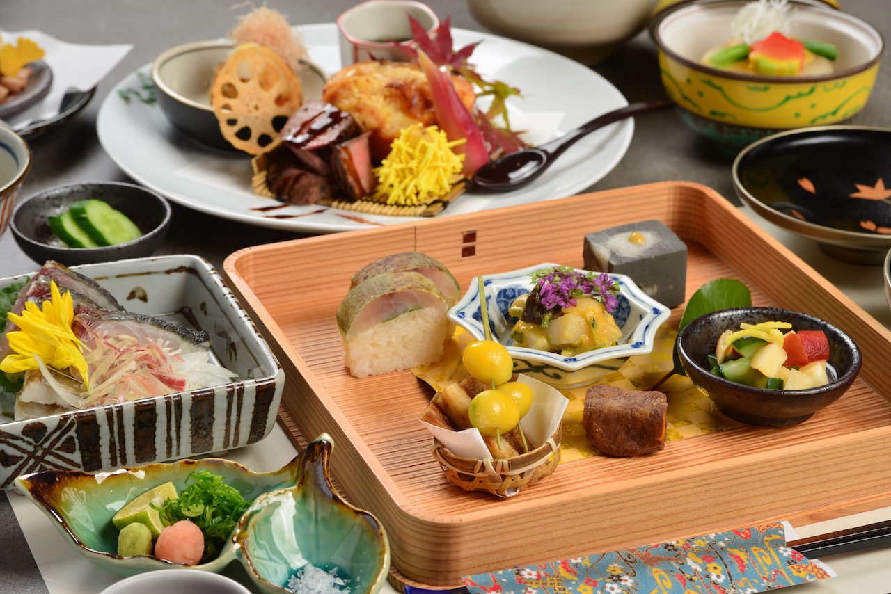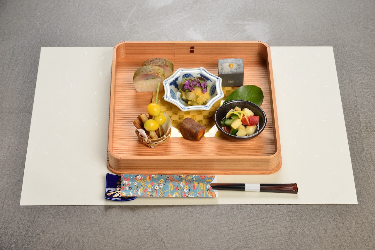 石垣寄せと林檎の膾(なます)/絹の小袖鮨/鳴門黄味鮨/南瓜の鴨巻き/銀杏丸十/末枯し牛蒡