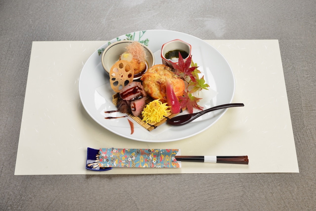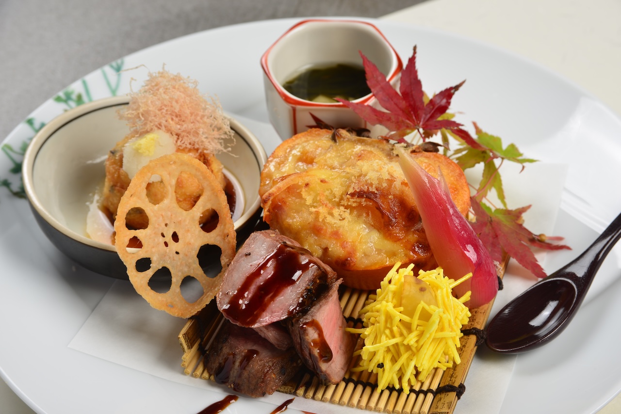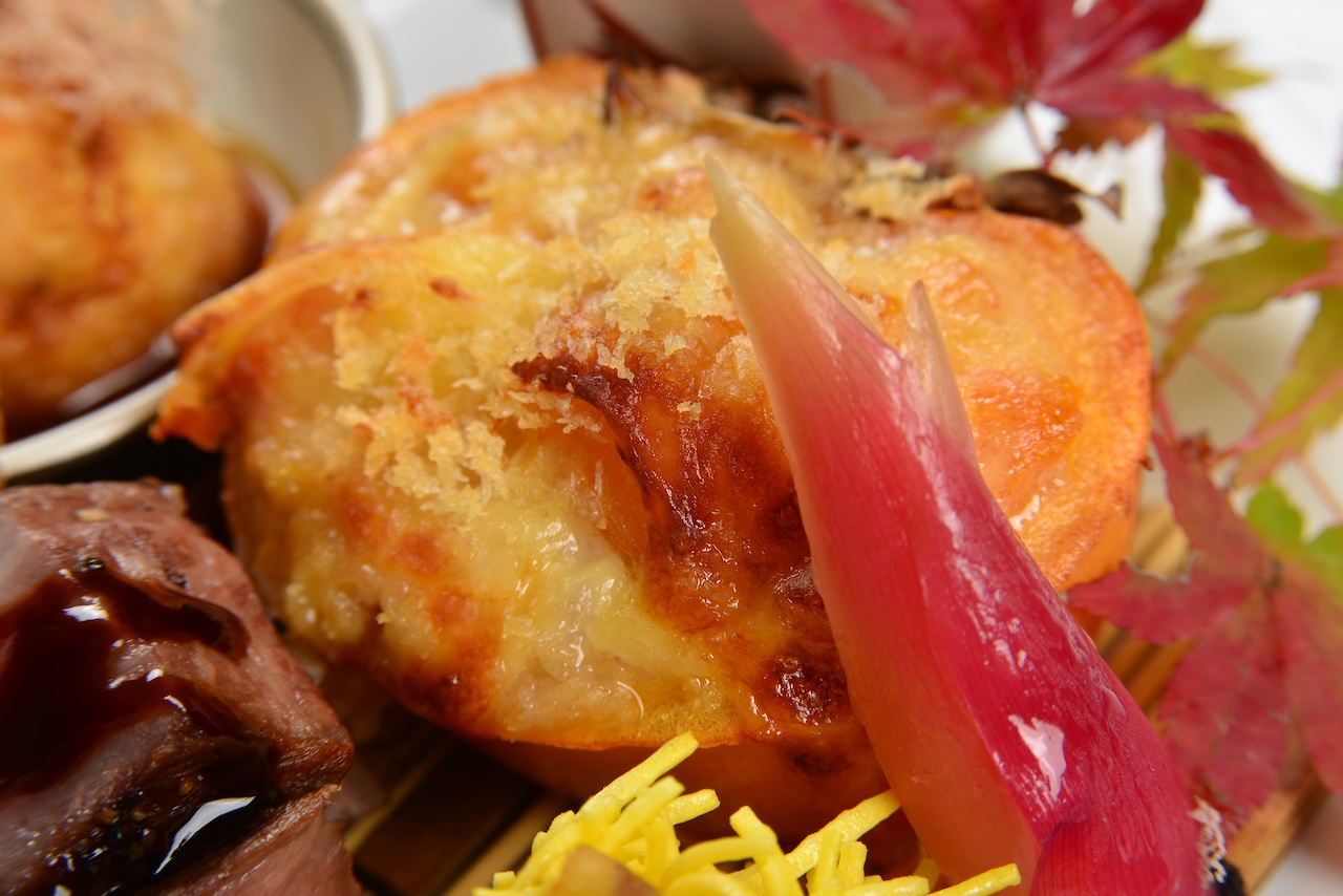 黒毛和牛炭火焼き/柿の和風グラタン/紅葉麩 鰻蓮根/鮭粕の飛龍頭