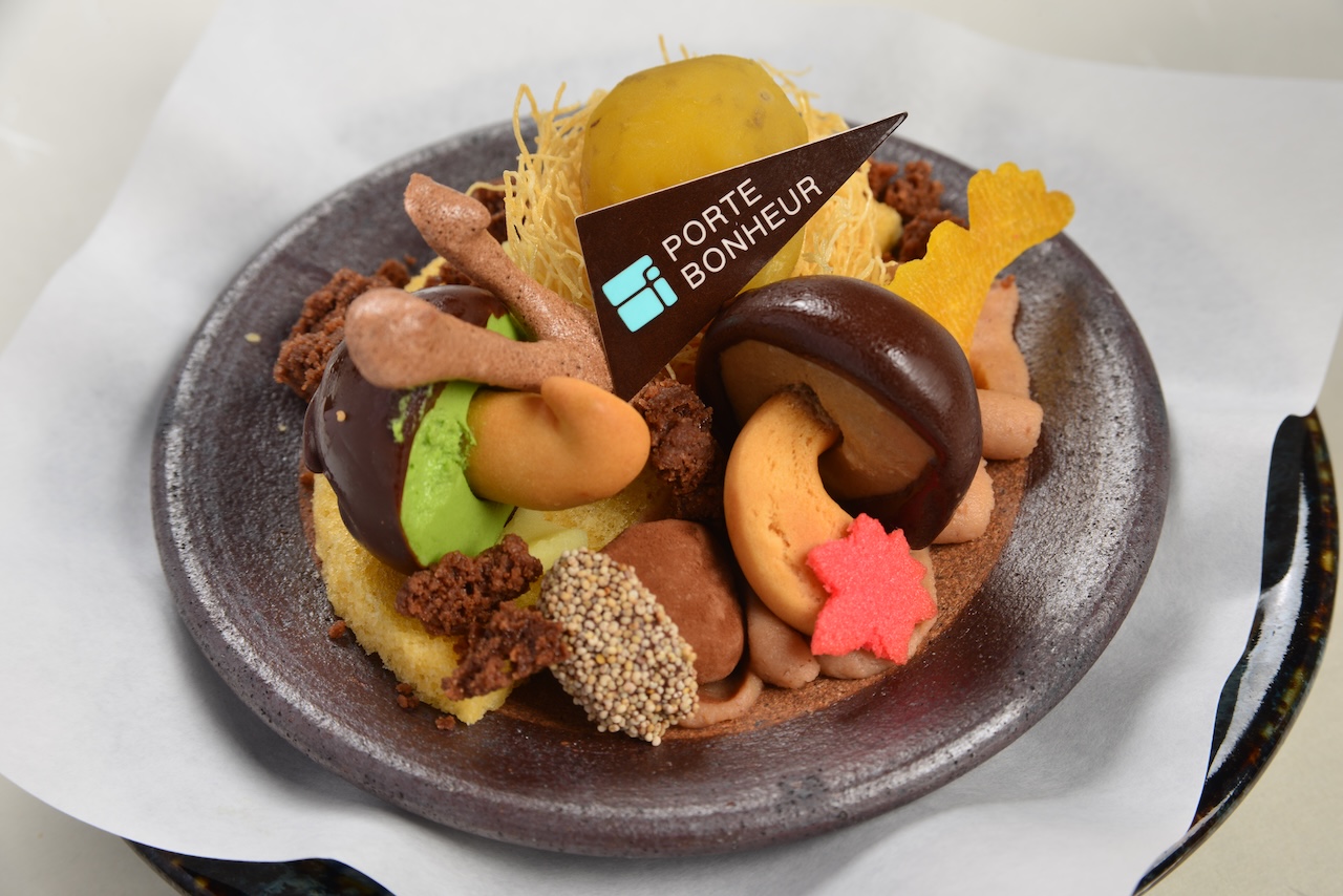 レストラン「Porte Bonheur」には、冬を迎える準備をする花々が咲き誇り、木の温もりとともにやさしい光が空間を包みます。生花の香り、器の艶、そして一皿に込められた祈り。