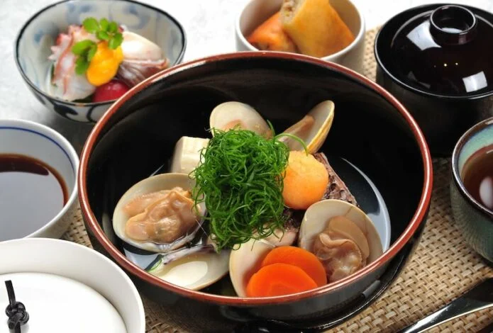 2022年 皐月御祝会席●御椀 鱧葛打ち 新順才 若芽 青瓜 梅肉 柚子 ●前菜 アスパラ豆腐 イクラ ・バイ貝旨煮 ・鱚の粽鮨 ・地蛸柔ら煮 胡麻酢 ・稚鮎 空豆 新挽粉揚げ 兜 ・砂肝卯の花和ゑ ・真鴨 新緑酢 ●造里 鰹タタキ 鮎並焼霜 生海胆 土佐醤…