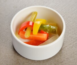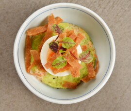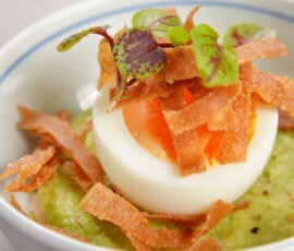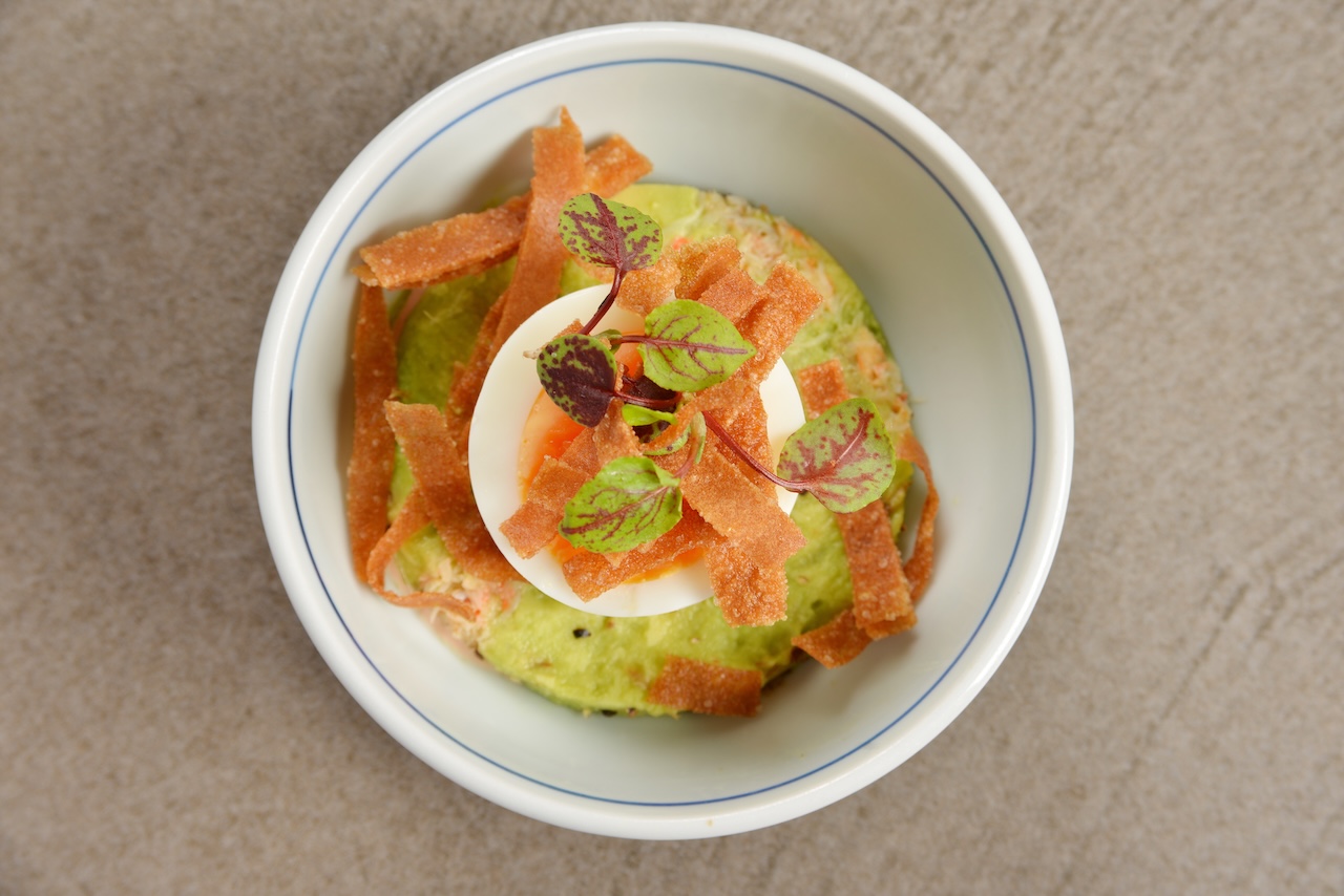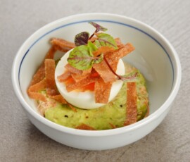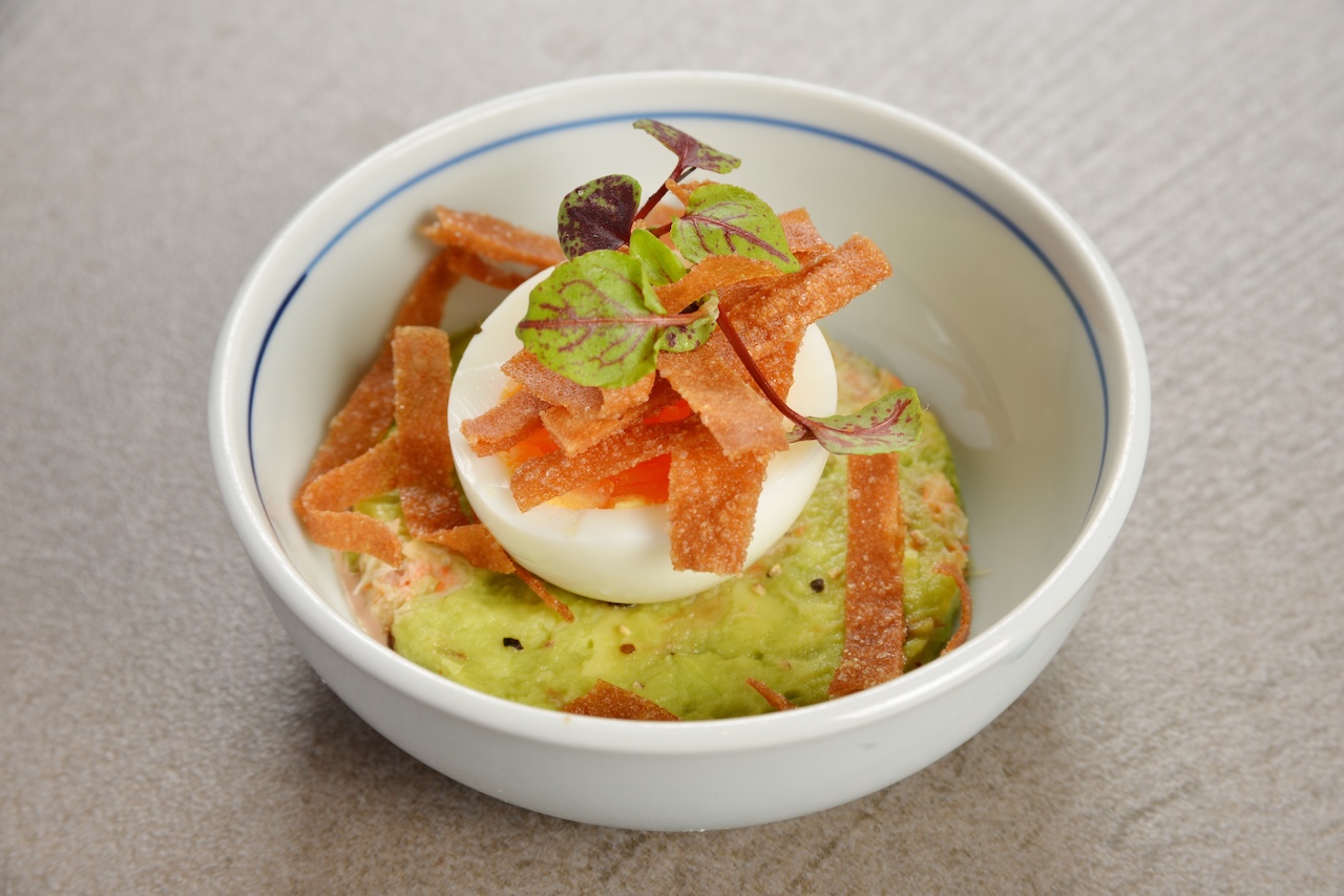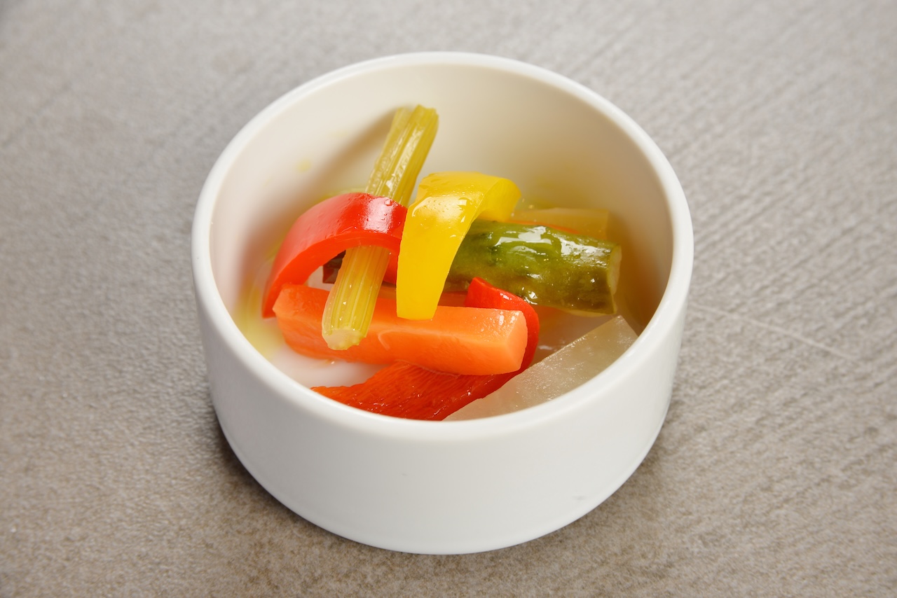 パプリカやセロリを使った自家製ピクルスは、爽やかな酸味が食欲をそそり、お口直しにもぴったり。アボカドのペーストにゆで卵とクリスピーなチップスをあしらった小鉢は、食感のアクセントも楽しい、目にも鮮やかな一皿です。 - ホッと心温まるスープ