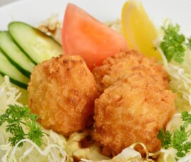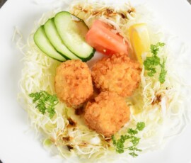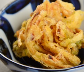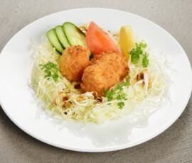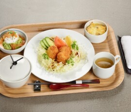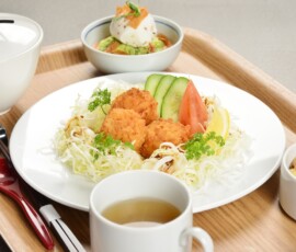 香ばしく揚げられた海老しんじょや、お野菜のかき揚げなど、食欲をそそるメニューもご用意。新鮮な生野菜やレモンを添え、後味はさっぱりと。栄養バランスを考慮しながら、満足感のある献立を心がけています。