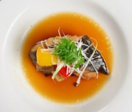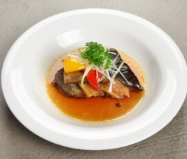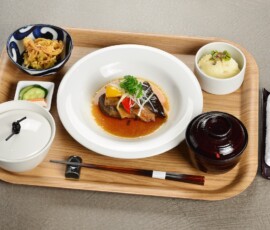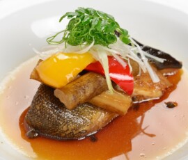 例えば、ふっくらと煮上げられたお魚の煮付け。旬の根菜やパプリカを添え、彩り豊かに仕上げています。良質なタンパク質とビタミンを、優しく奥行きのある味わいで摂取いただけます。