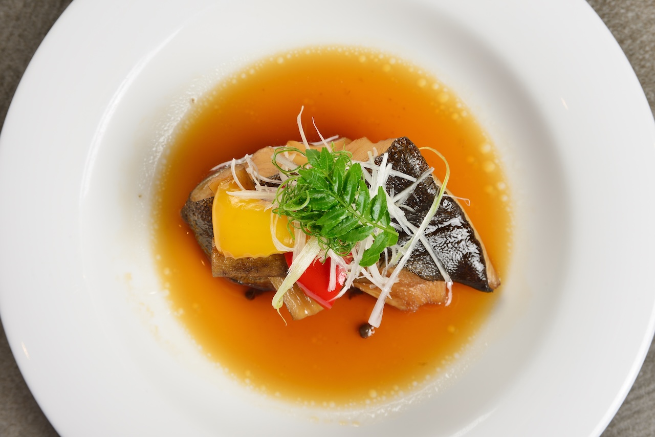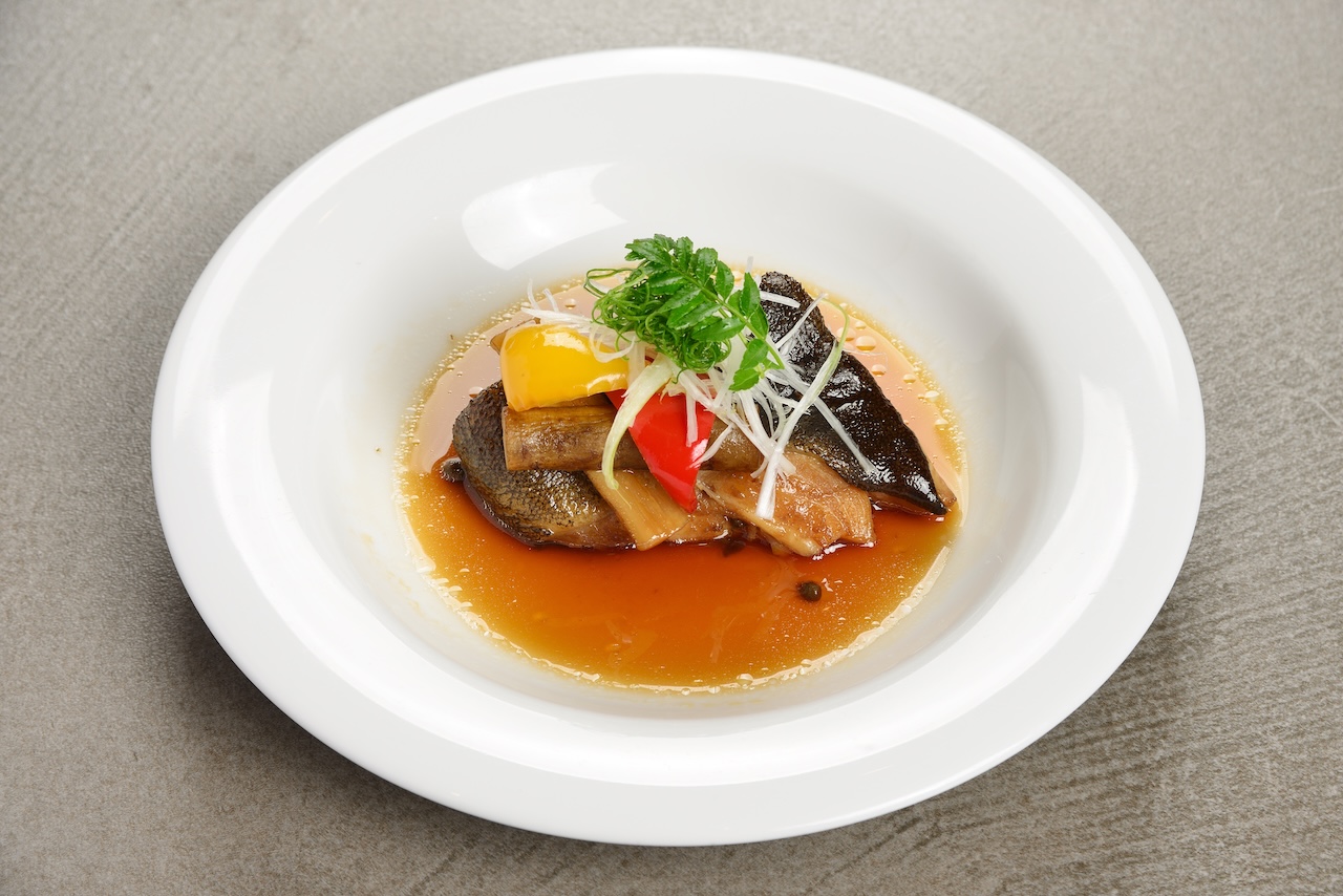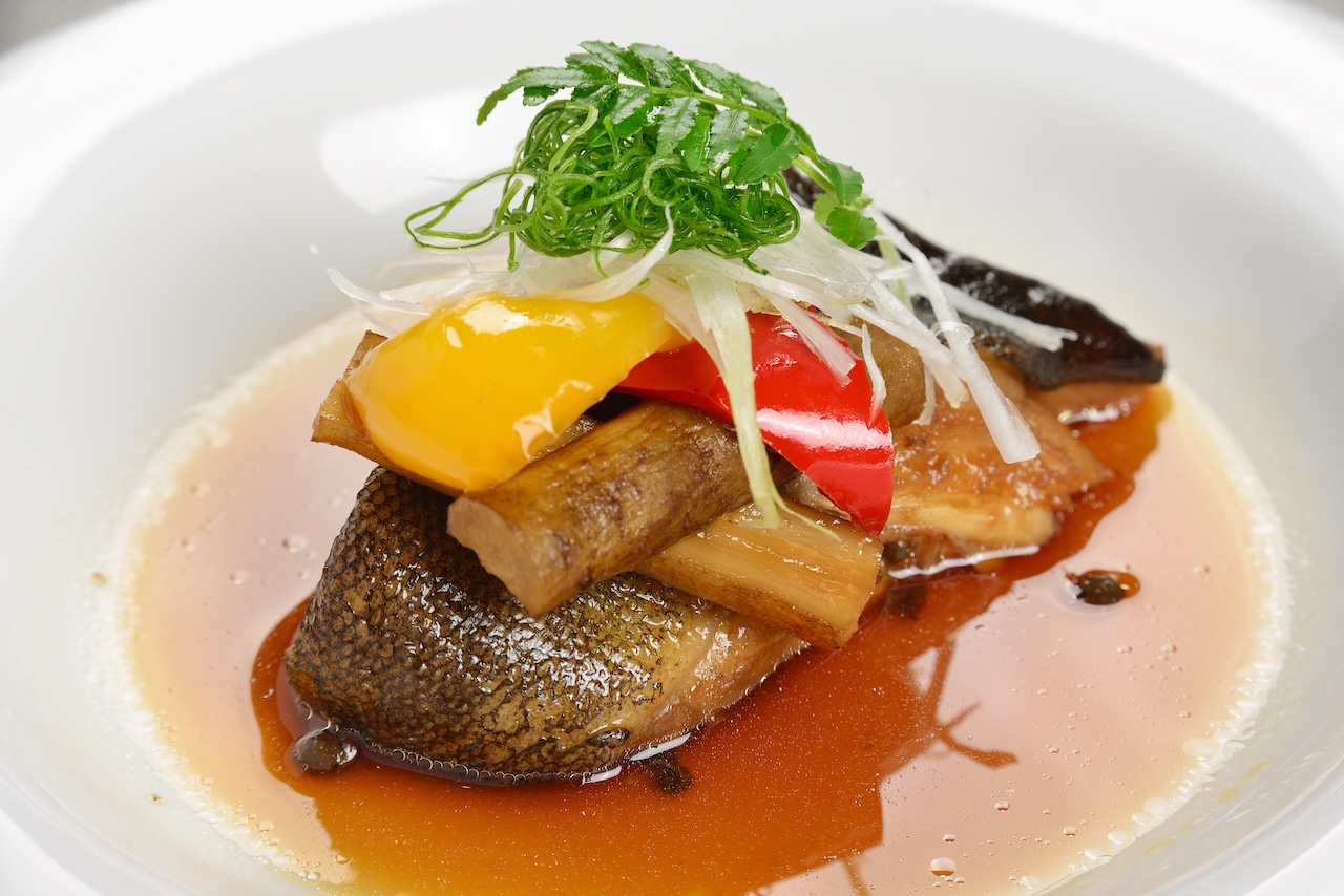 例えば、ふっくらと煮上げられたお魚の煮付け。旬の根菜やパプリカを添え、彩り豊かに仕上げています。良質なタンパク質とビタミンを、優しく奥行きのある味わいで摂取いただけます。